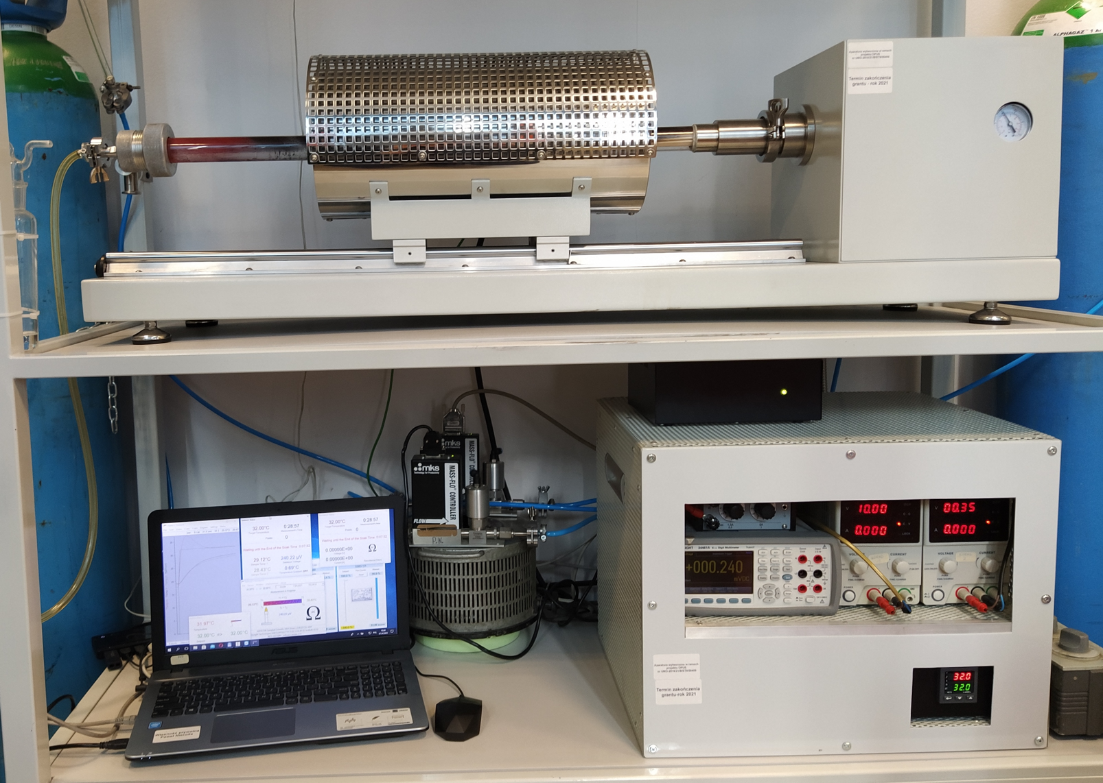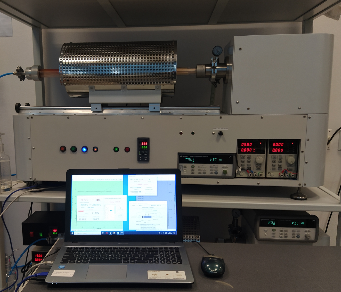 Apparatus for measuring Seebeck coefficient α and electrical conductivity σ as a function of temperature (25-900°C). Working in inert and in oxidizing atmosphere.